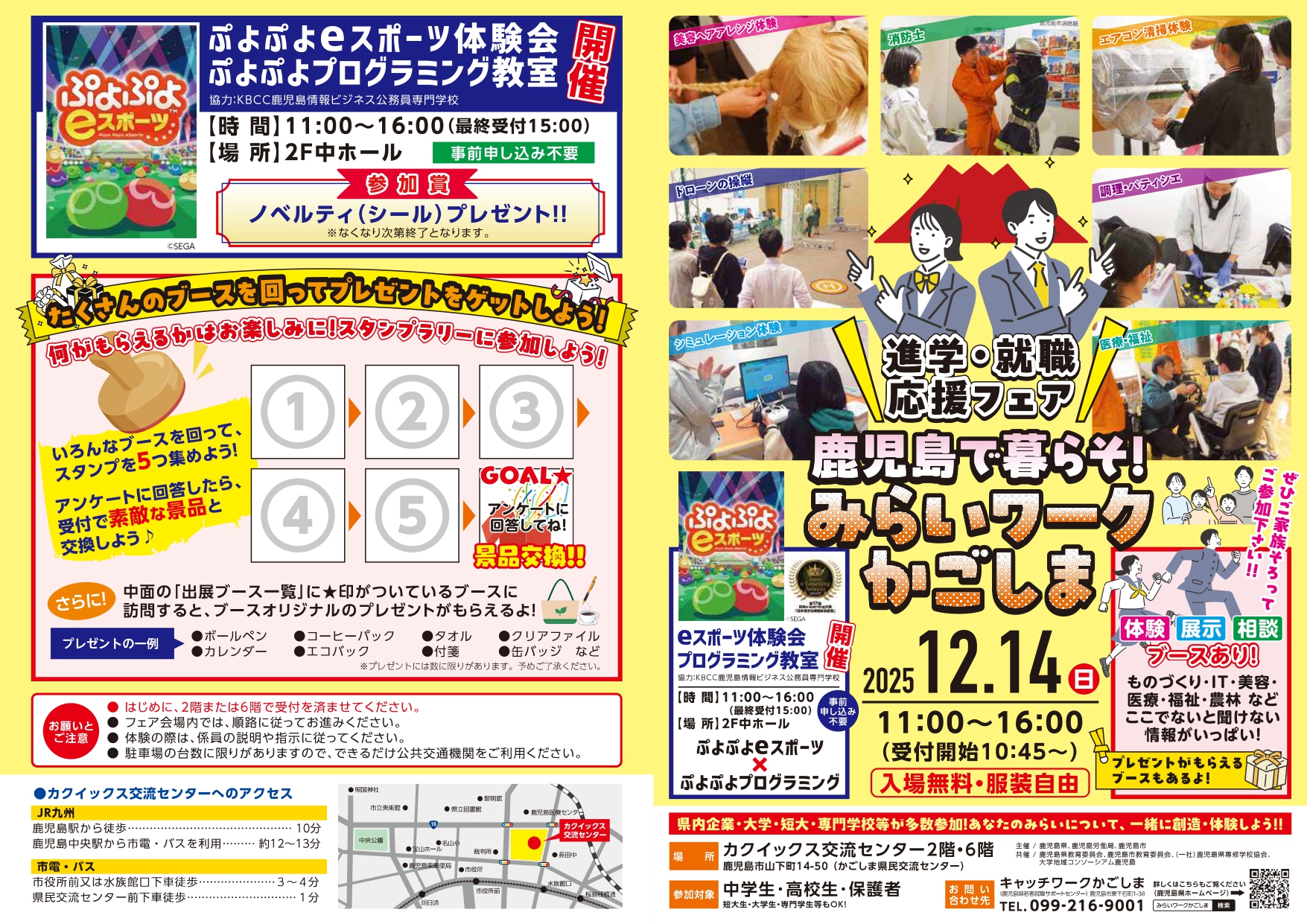 12月14日(日)にカクイックス交流センター(旧:鹿児島県民交流センター)にて開催される進学・就職応援フェア「みらいワークかごしま」に本校が出展します。